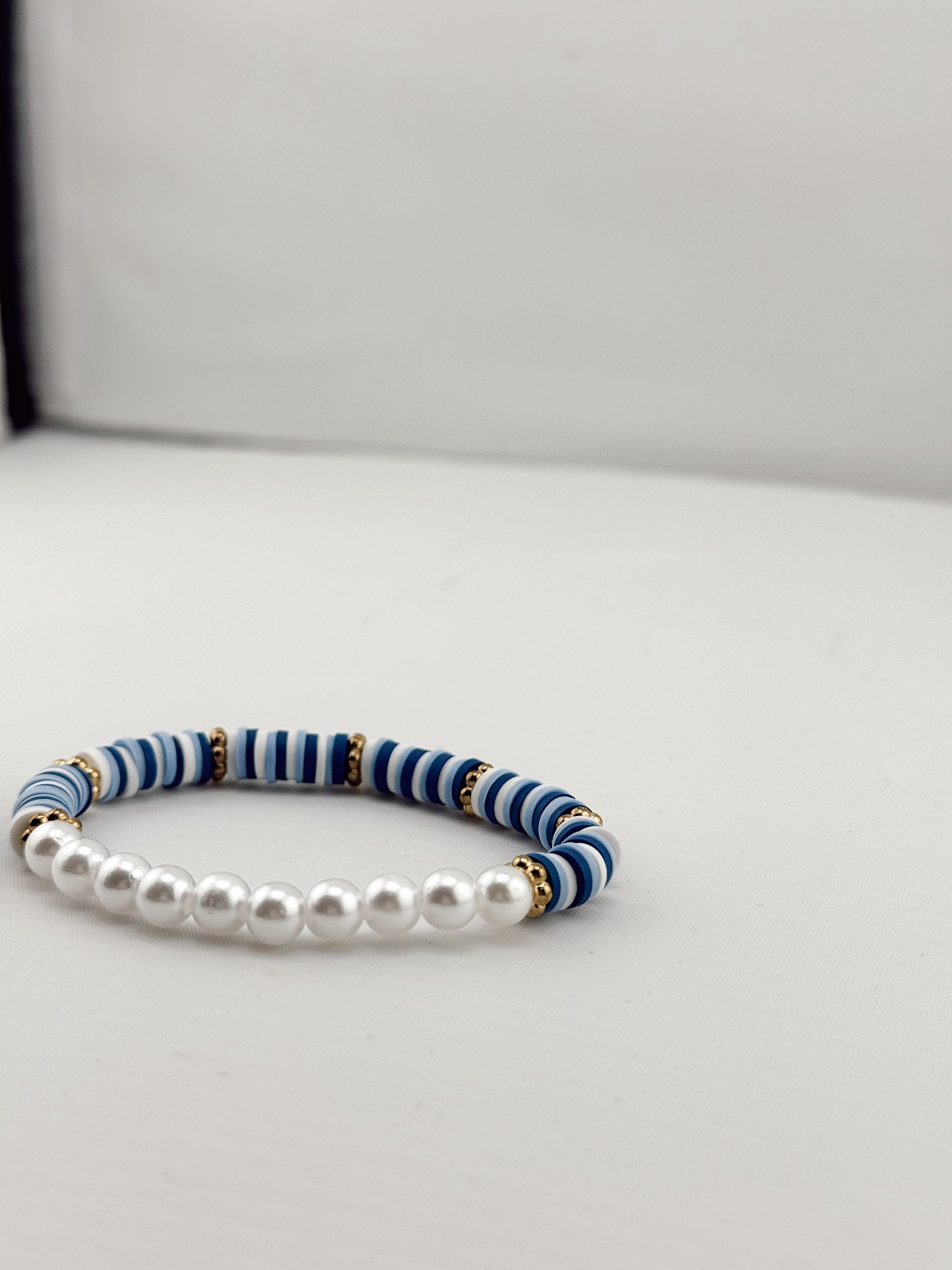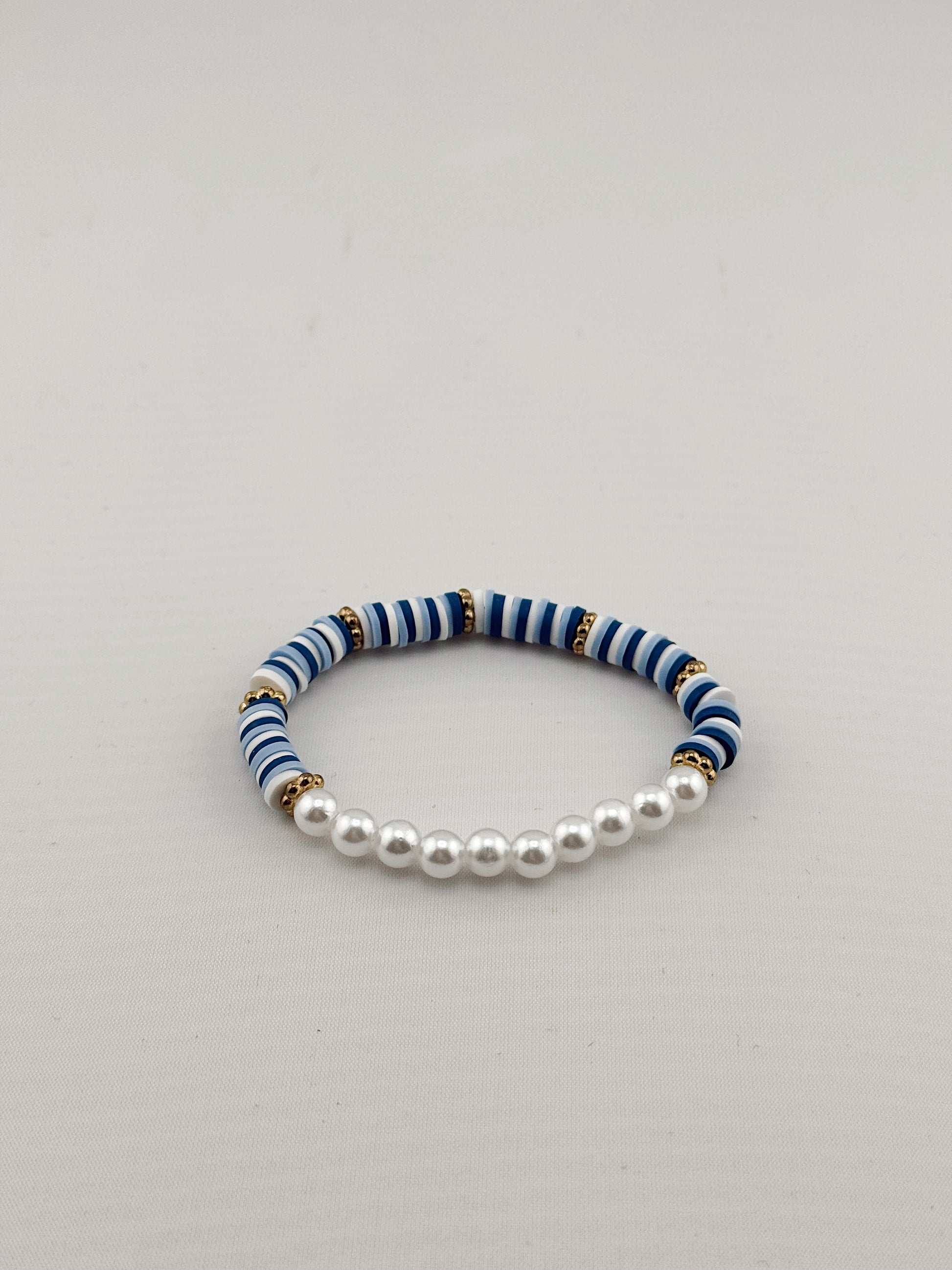 This charming bracelet blends playful blue-striped beads with classic white pearls, creating a fresh, coastal-inspired accessory that feels both modern and timeless. Accented with tiny gold spacers, it’s the perfect piece to elevate your everyday style or add a touch of elegance to your summer look.