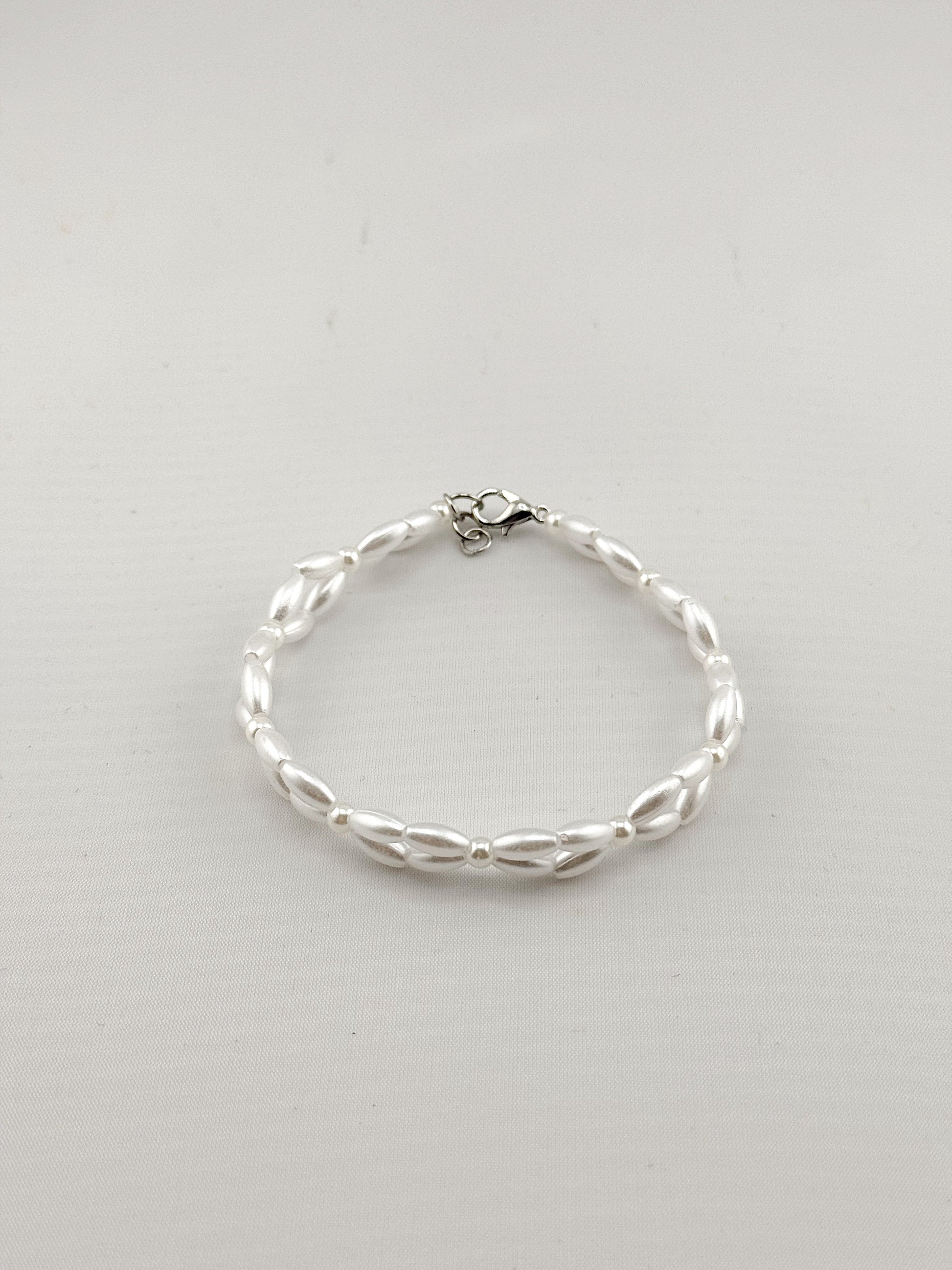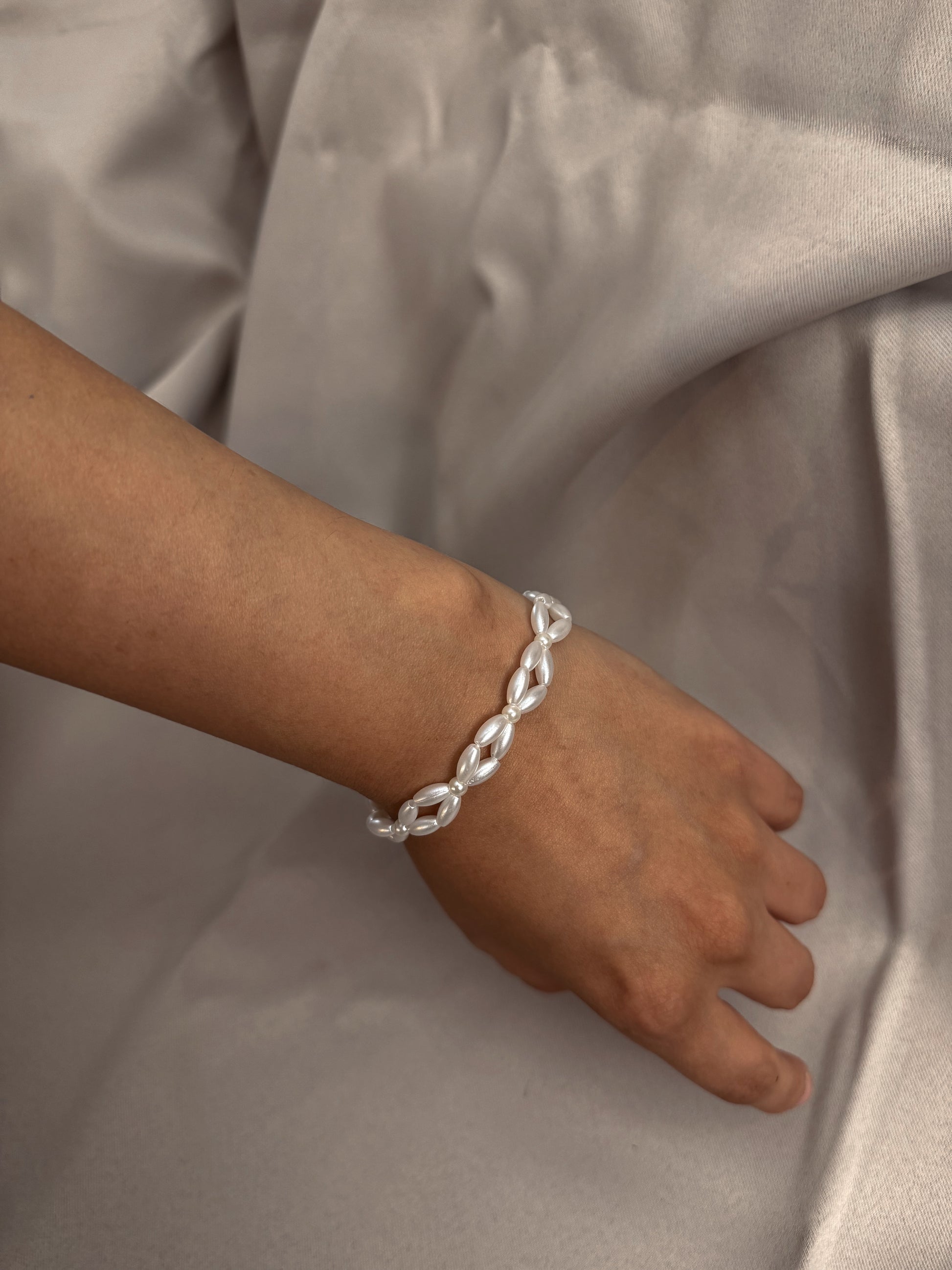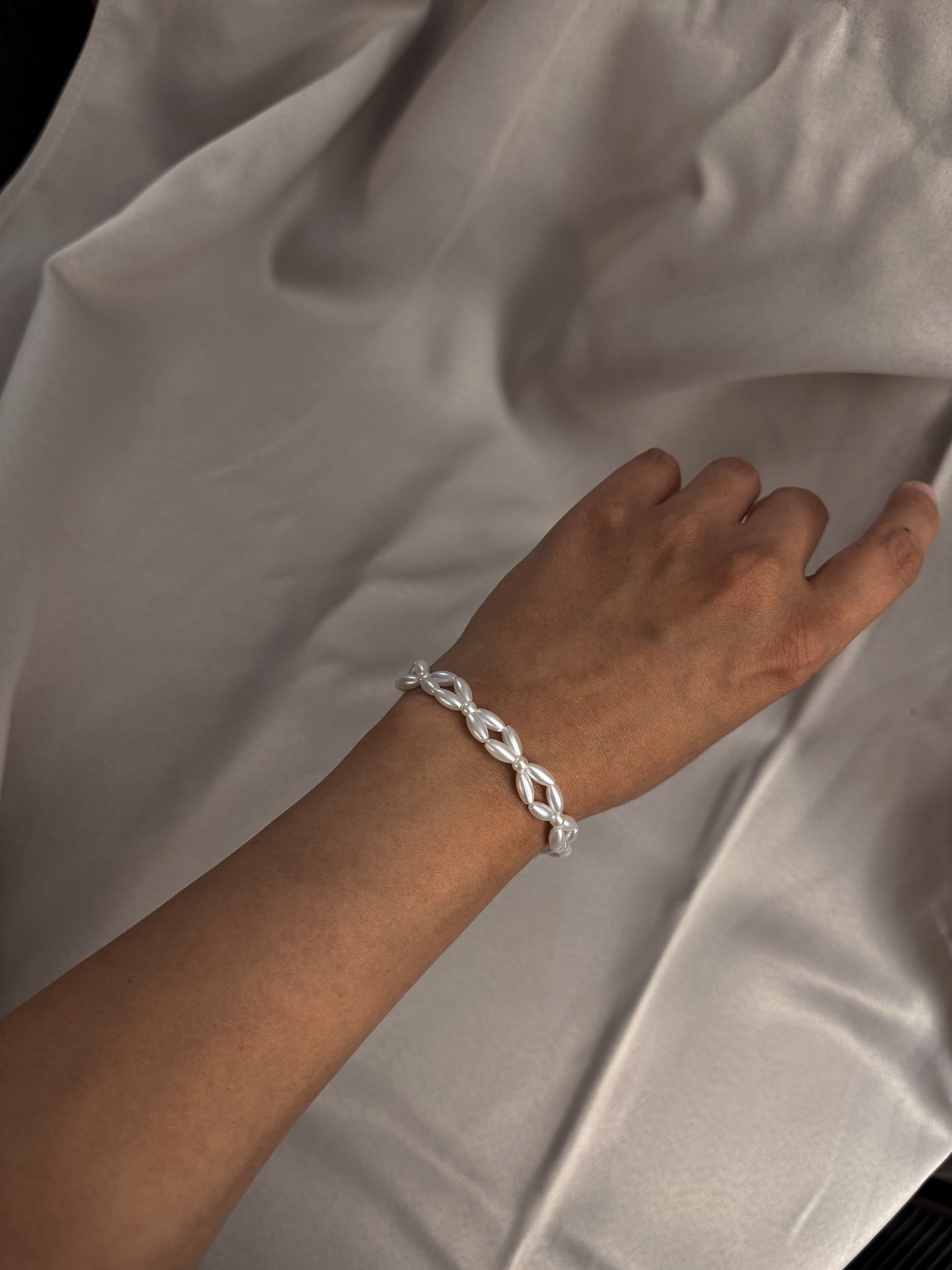 Delicate yet striking, this handmade bracelet features elegant rice-shaped pearls woven into a graceful flower -like pattern. Each pearl is carefully strung to create a soft, organic flow, giving this piece a refined and timeless look. Perfect for weddings, everyday wear, or thoughtful gifting, this bracelet adds a touch of classic sophistication to any outfit.