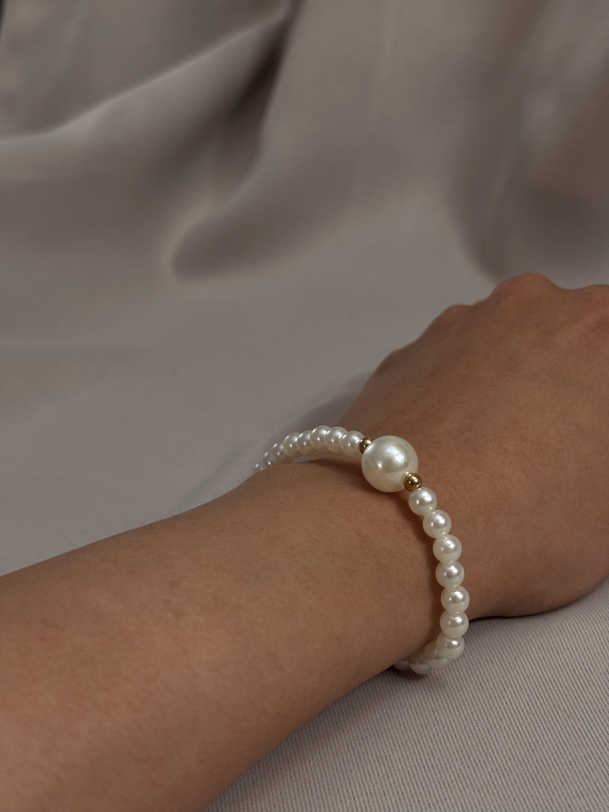 Gracefully simple yet undeniably chic, this pearl bracelet brings a classic charm to your jewelry collection. Featuring a delicate string of glossy white pearls, finished with a single statement pearl at the center and tiny golden accents, it’s a piece that speaks elegance in whispers.