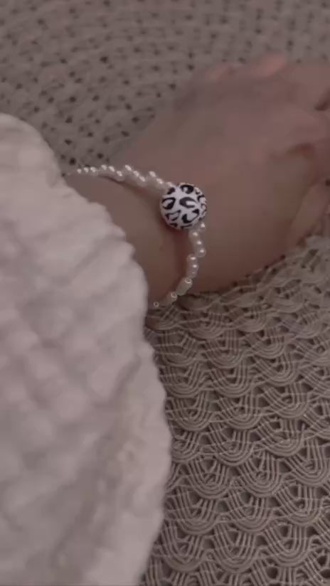 Pearl Beaded Bracelet with Leopard Print Wooden Bead