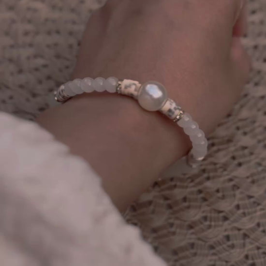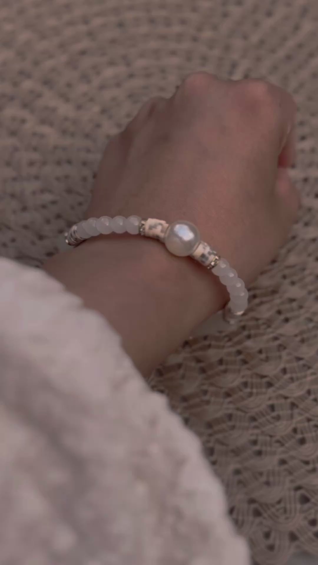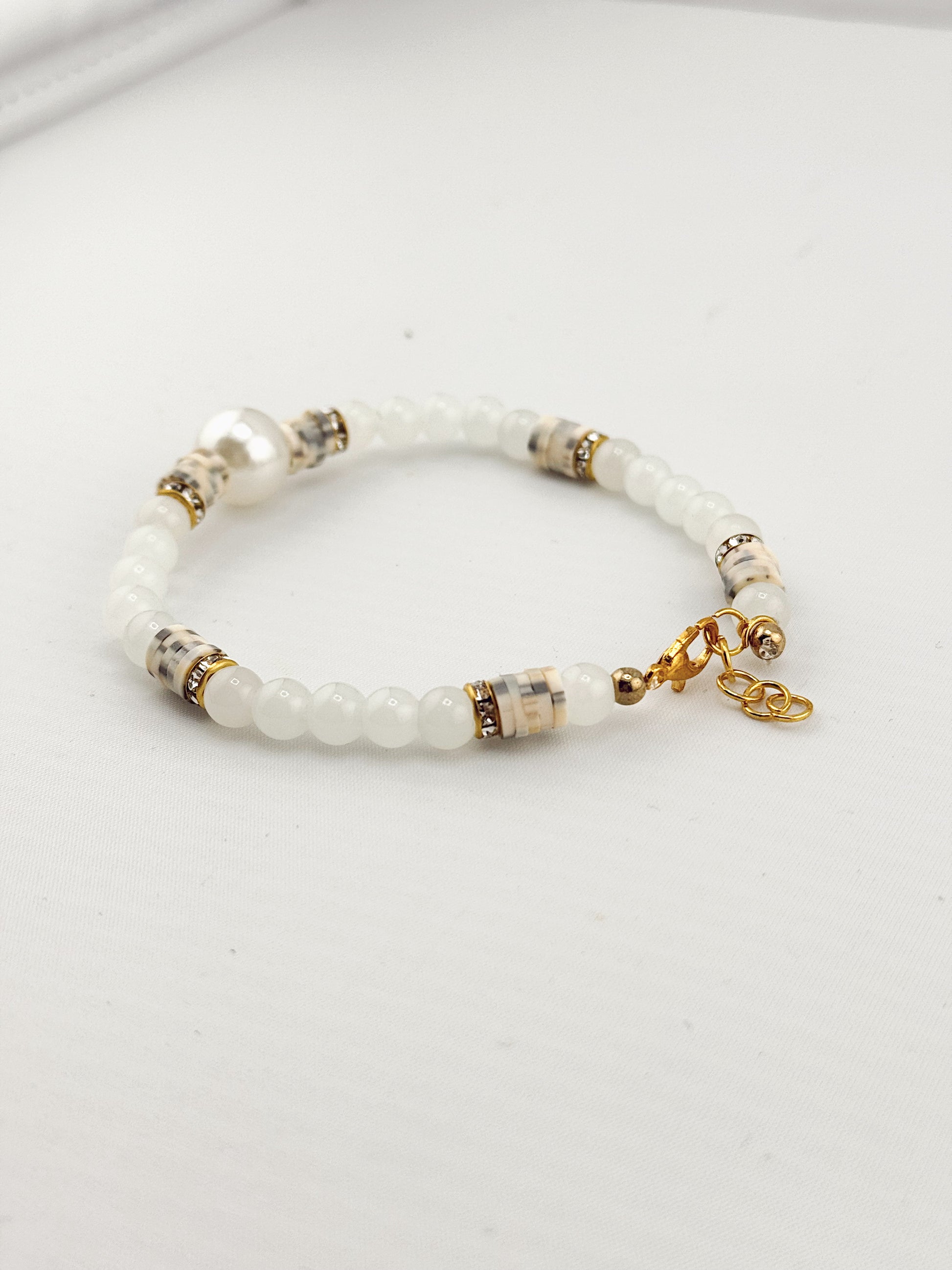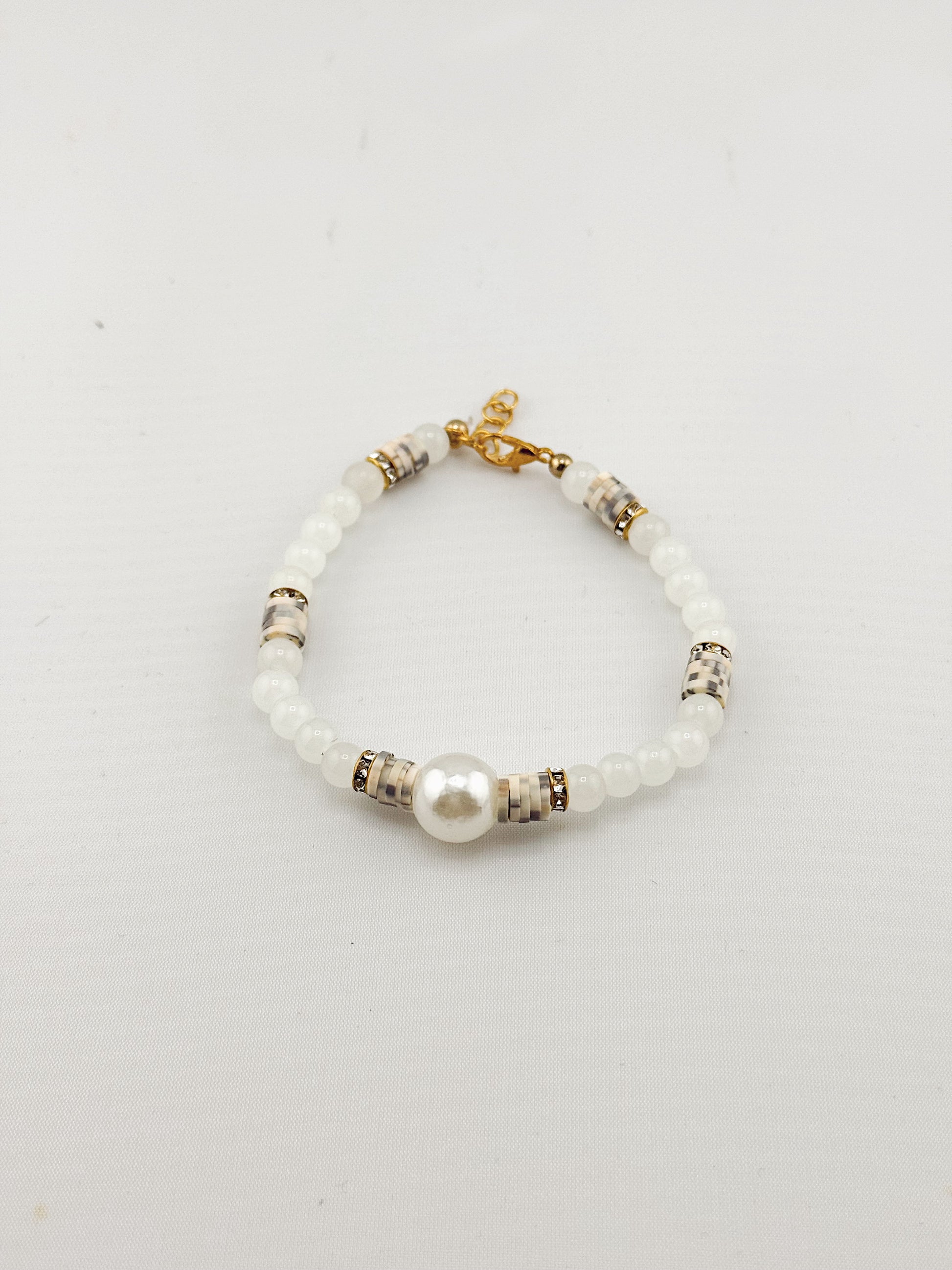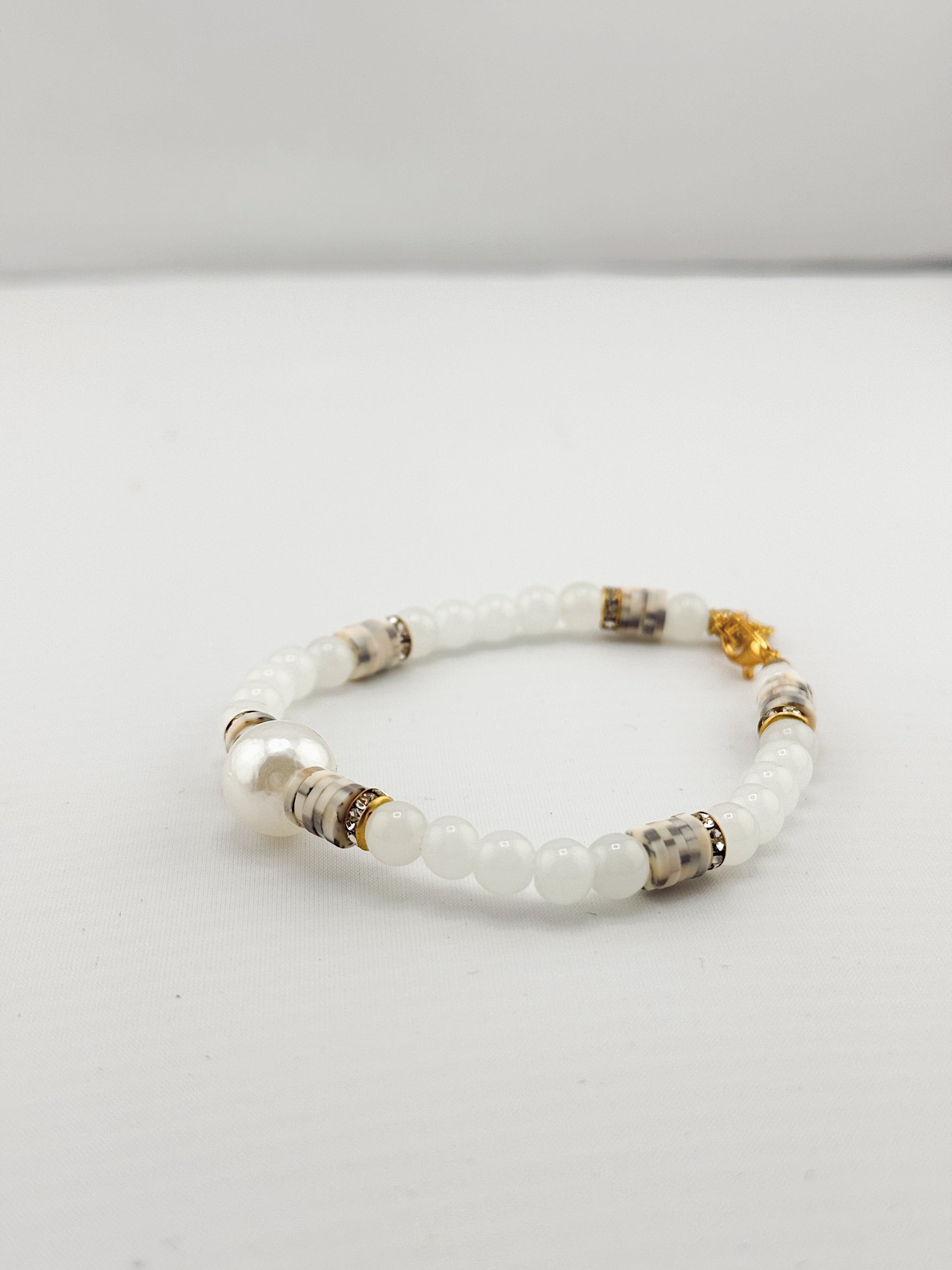 Add a touch of timeless elegance to your style with this handmade white beaded bracelet. Featuring smooth white agate stones, a luminous central pearl bead, and delicate gold-toned accents, this bracelet is the perfect accessory for any occasion—from casual days to formal nights.
